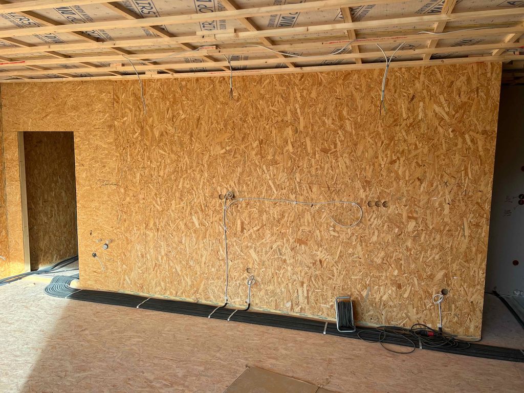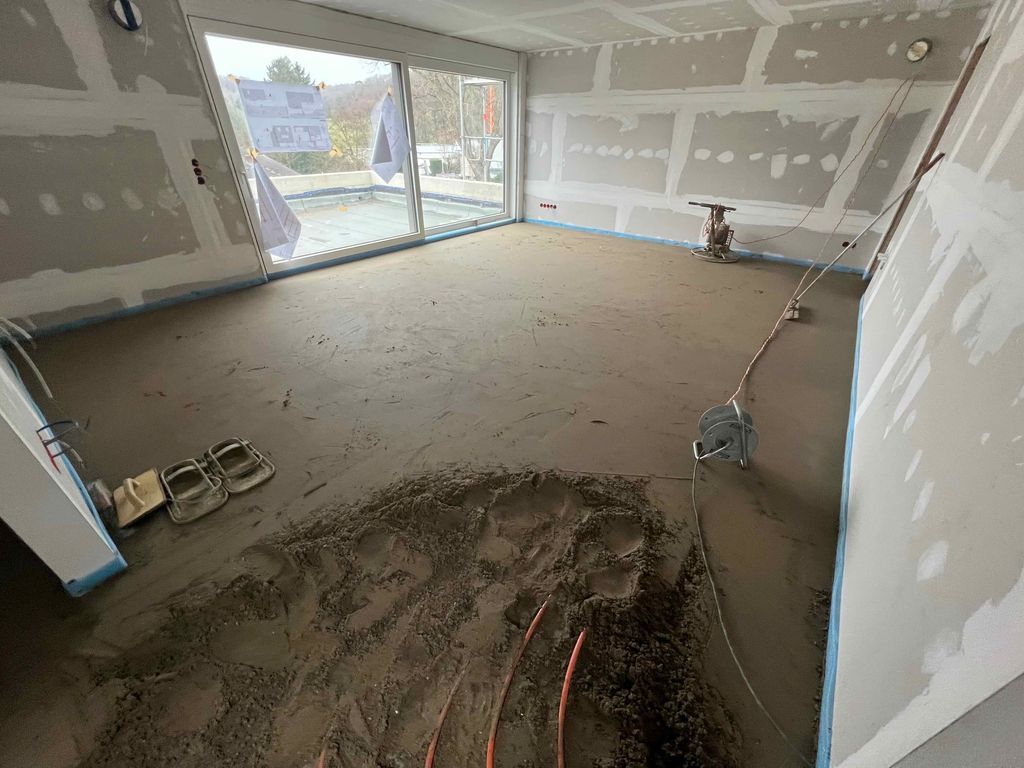 Nachdem alle Vorarbeiten und der Einbau der Fußbodenheizung abgeschlossen sind, kommt nun der Estrich.