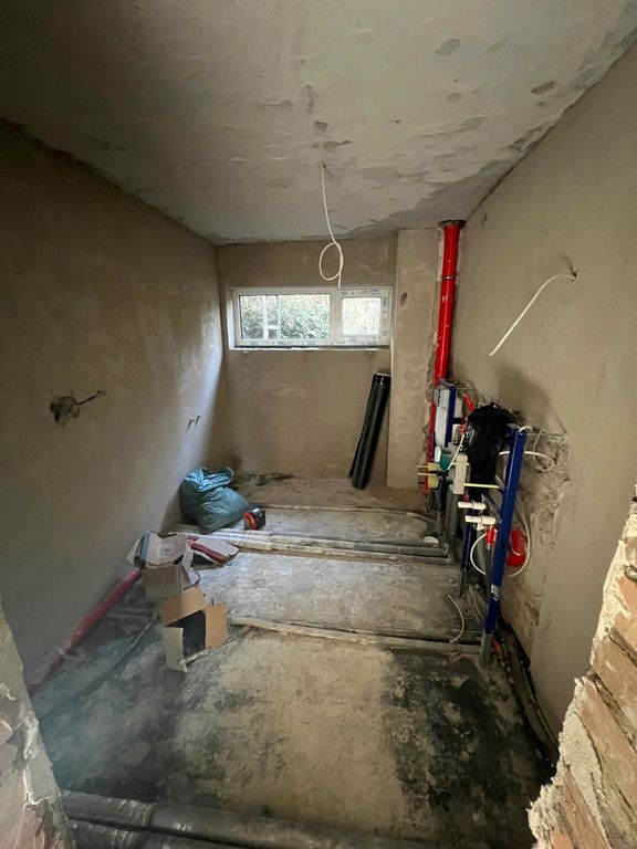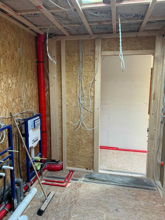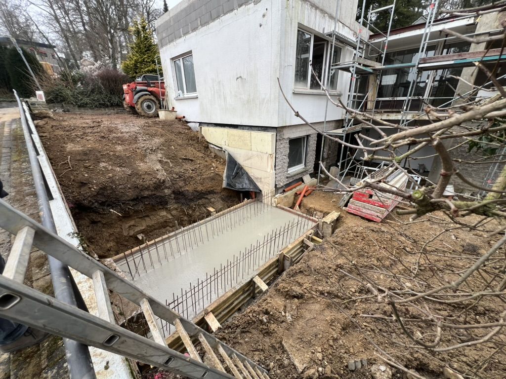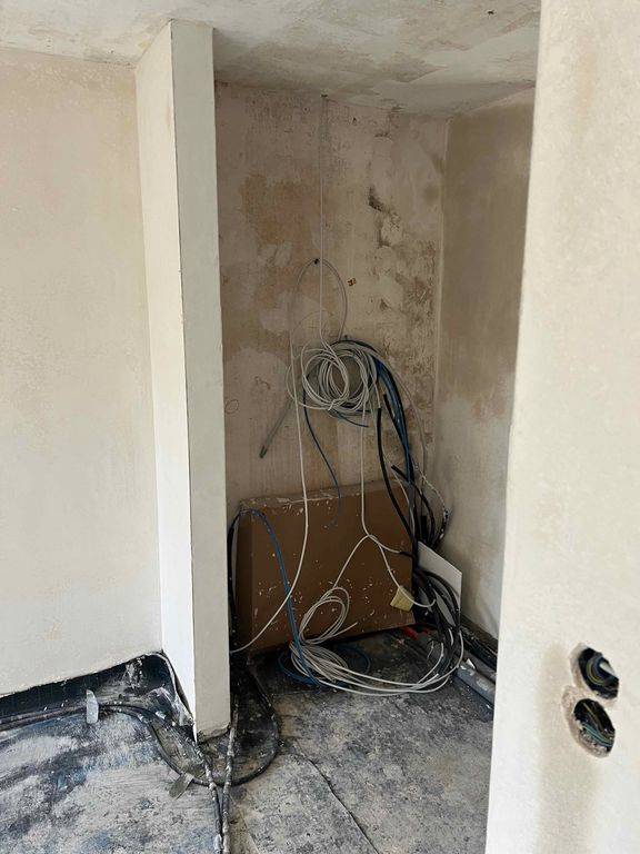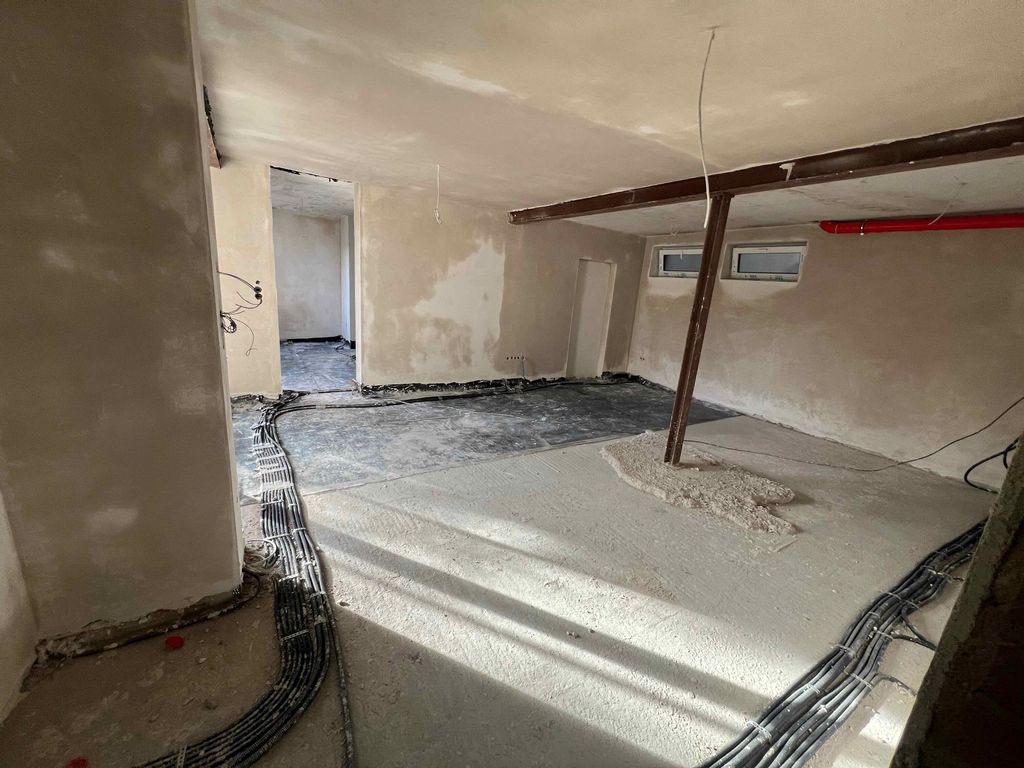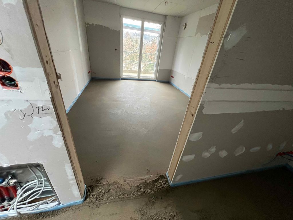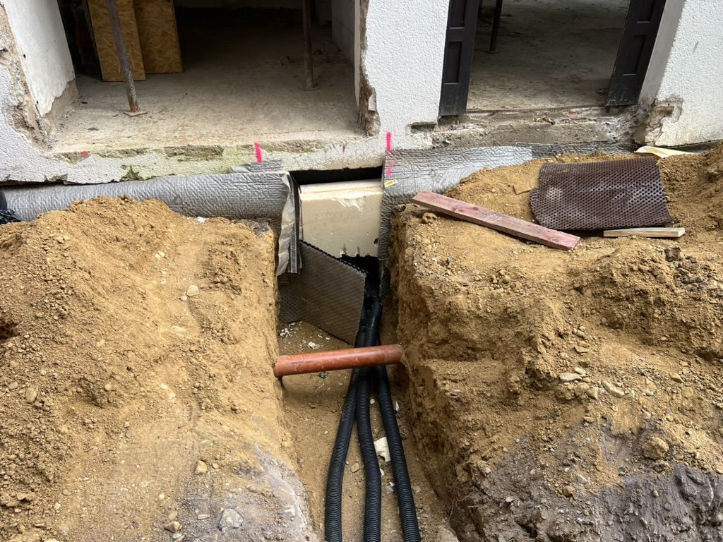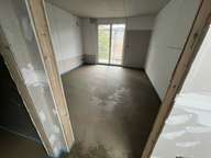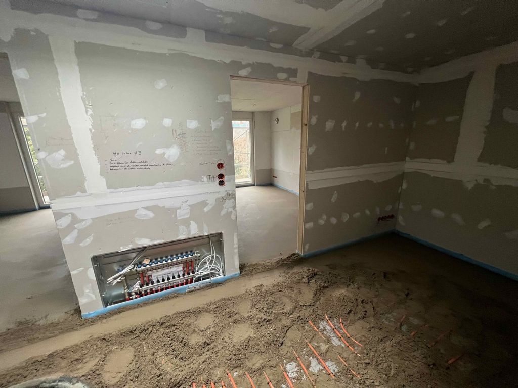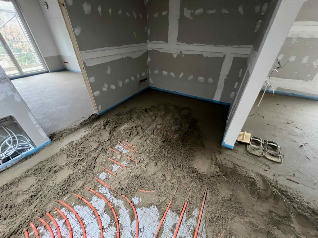 Hier wird nachher niemand mehr kalte Füße bekommen. Mit der neuen Fußbodenheizung haben wir eine effiziente und komfortable Wärmeversorgung. Die Wärmepumpe wird mit einer Solaranlage kombiniert, um die Energieversorgung der Wohnung nachhaltig zu gestalten.